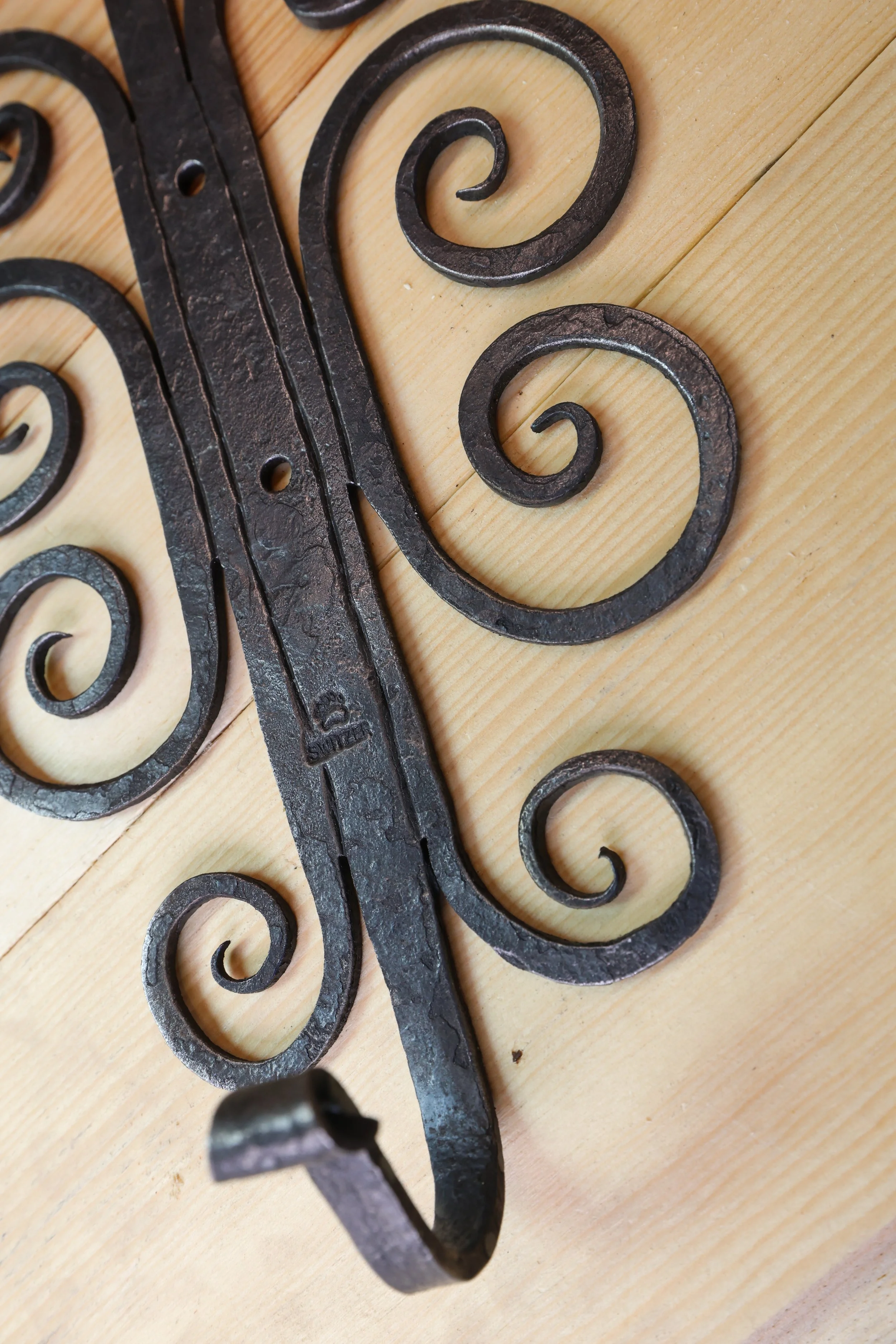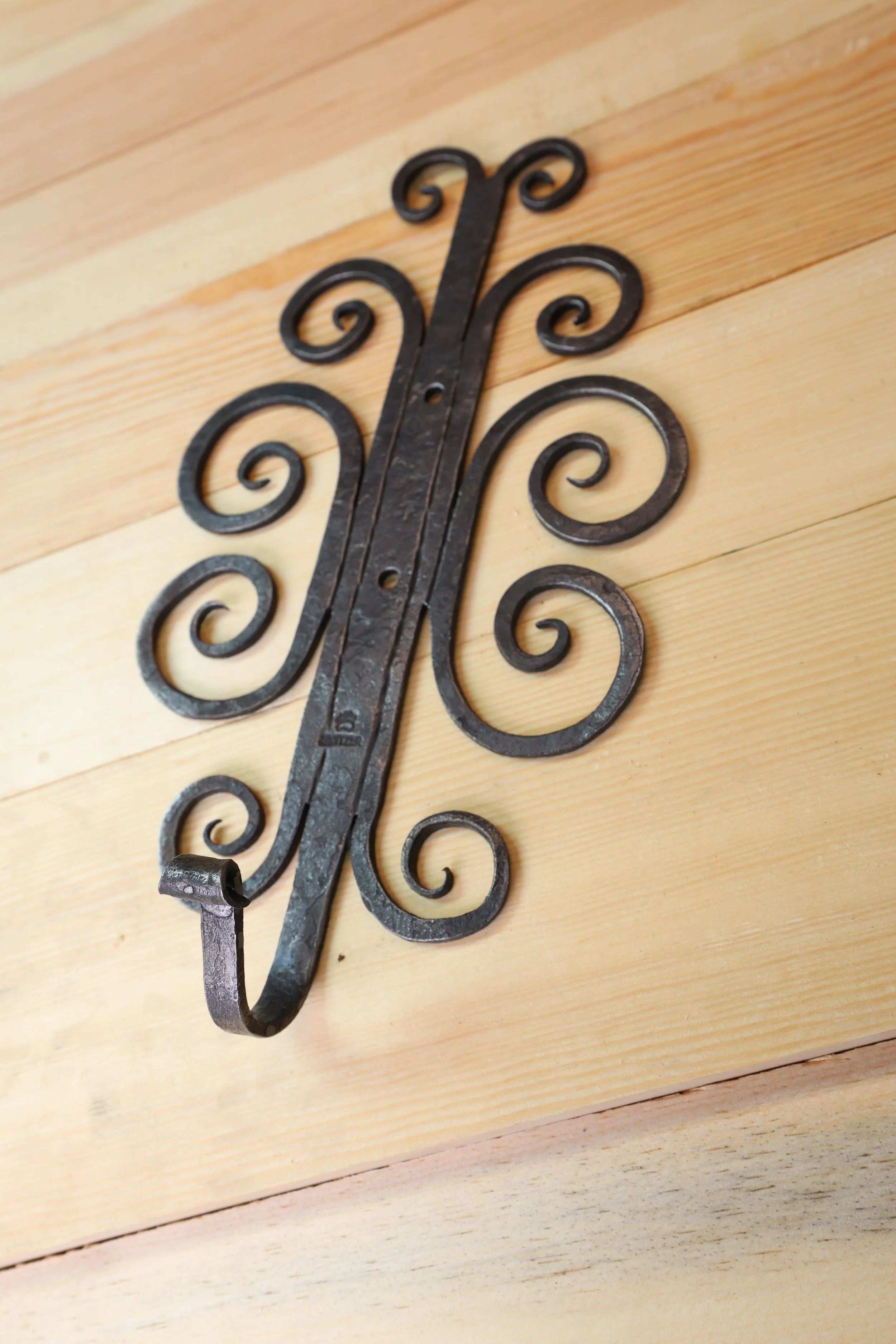 This ornate scrolled hook is inspired by some seen in Taos New Mexico. Forged from a single bar of 1/8” steel with the scrolls cut and then forged to shape. This hook achieves a balance between elegance and the rustic charm that is so common in the work from that area.